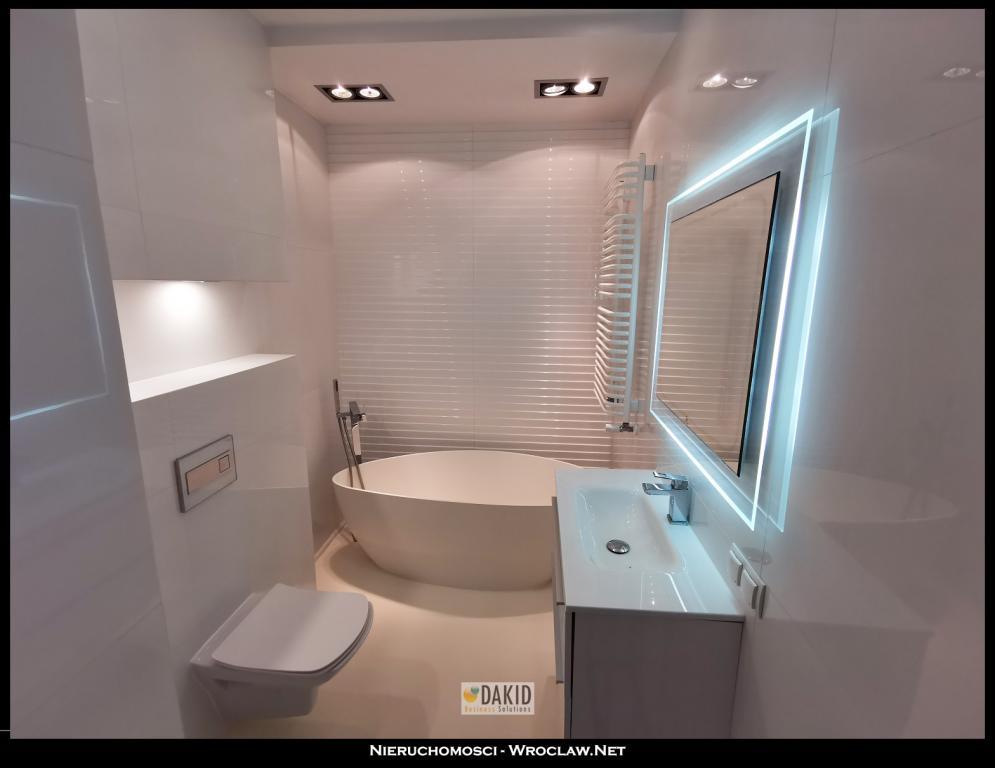 Large bathroom with bath and enlighted mirror.Cena | Price: 4350 zł + media and utilities.