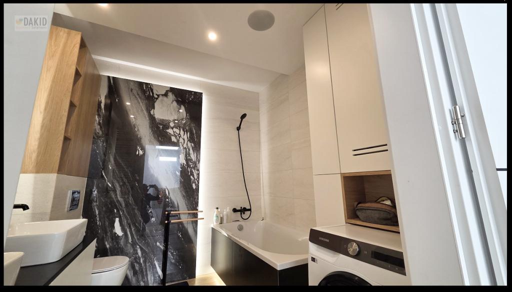 Additional audio systems and air conditioning installed.The house has been carefully designed and finished according to a custom architectural project. High-quality built-in kitchen furniture and a fully equipped kitchen. Furniture made of sesame wood, Hi-Fi system and TV included. Bathroom with LED lighting, audio system, bathtub, and shower.