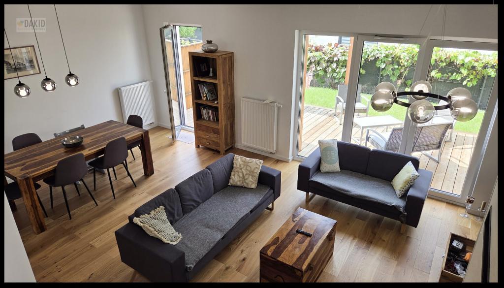 The central part of the house is a large, bright living room of … m² combined with the kitchen and opening onto the terrace. The upper level contains four bedrooms. The layout is very functional, with sunny interiors — perfect for a family with children or a couple working from home. Rental for a company is also possible.